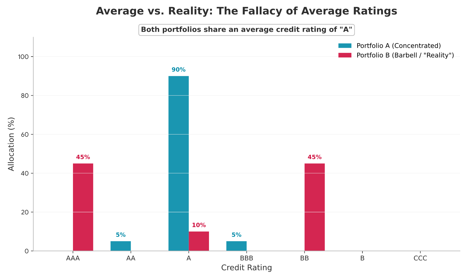 Portfolios are typically reported through aggregated metrics: average credit rating, average duration, and yield. These compress two independent dimensions of risk: