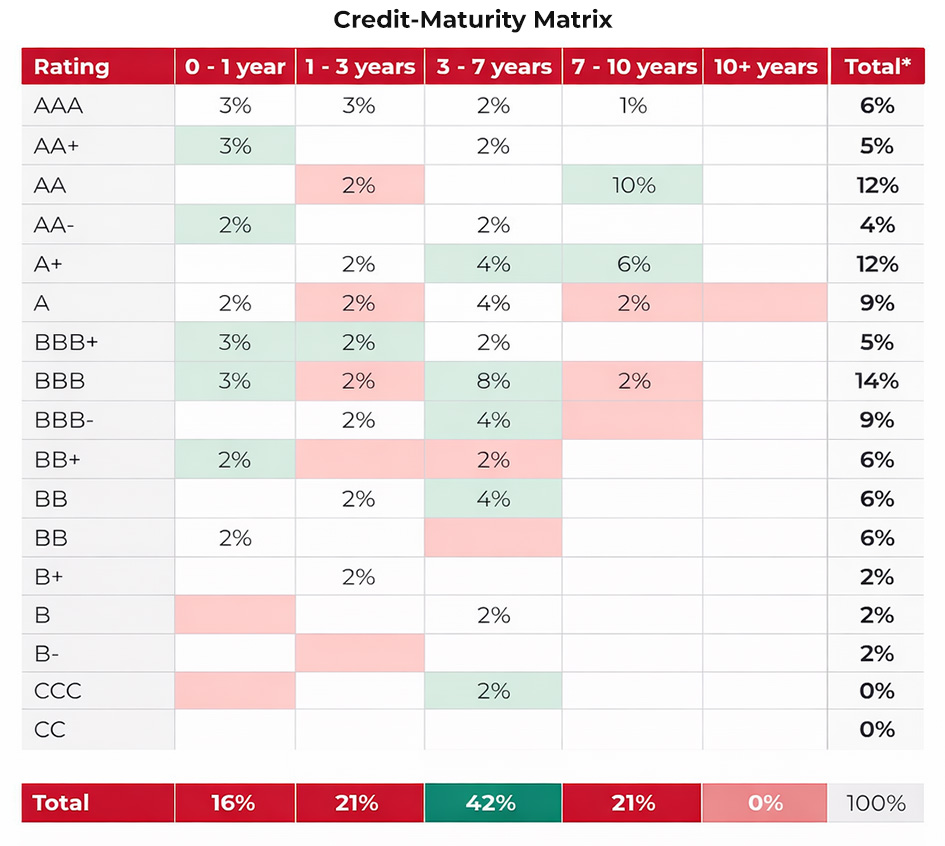 What it does: Maps the portfolio across two axes — credit quality and maturity — revealing the full distribution of exposures.